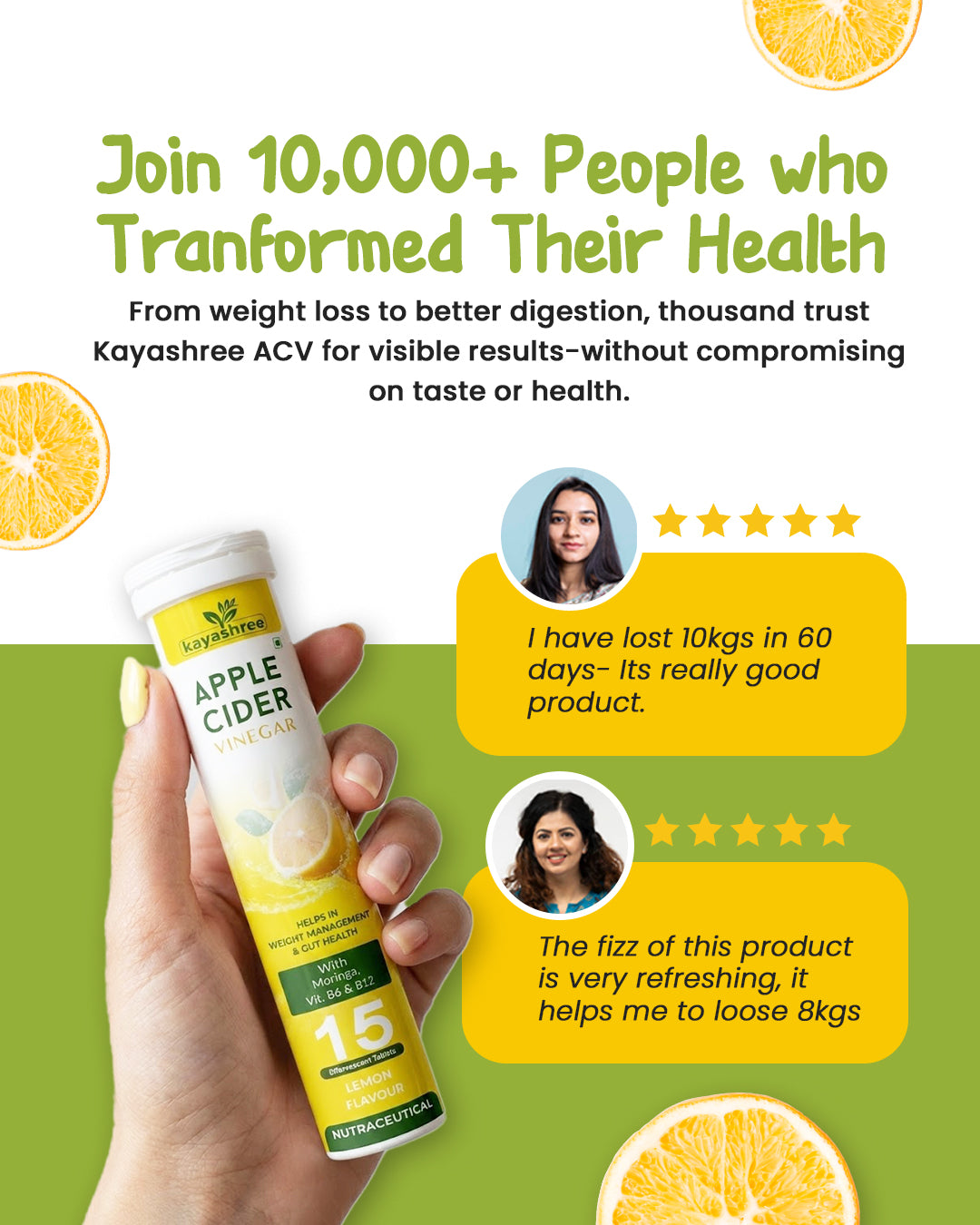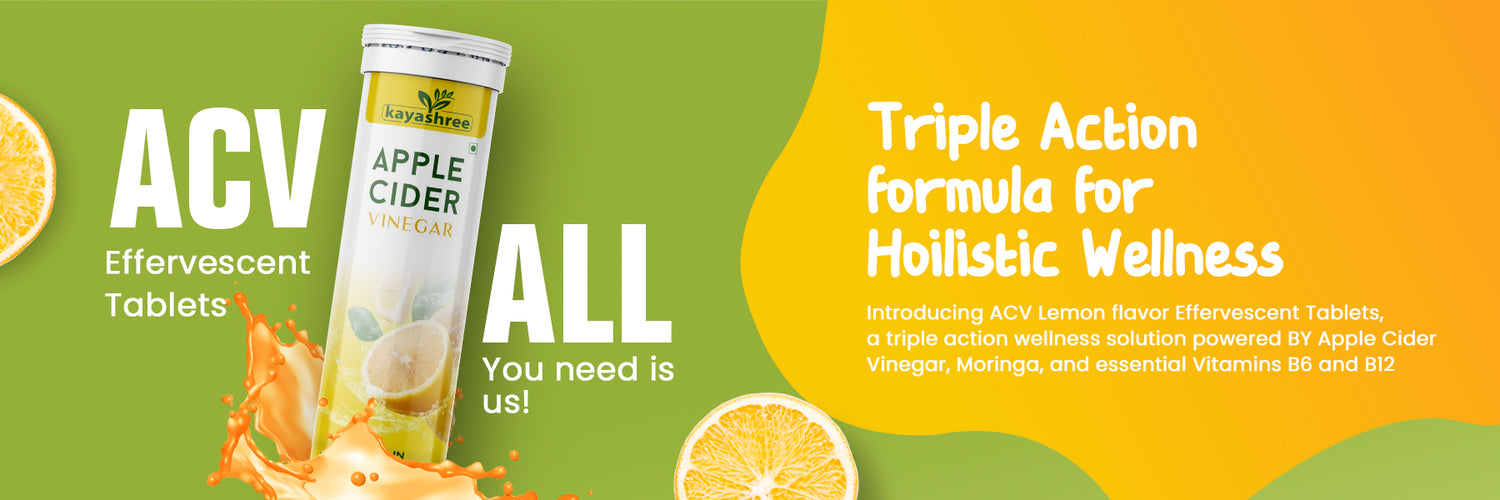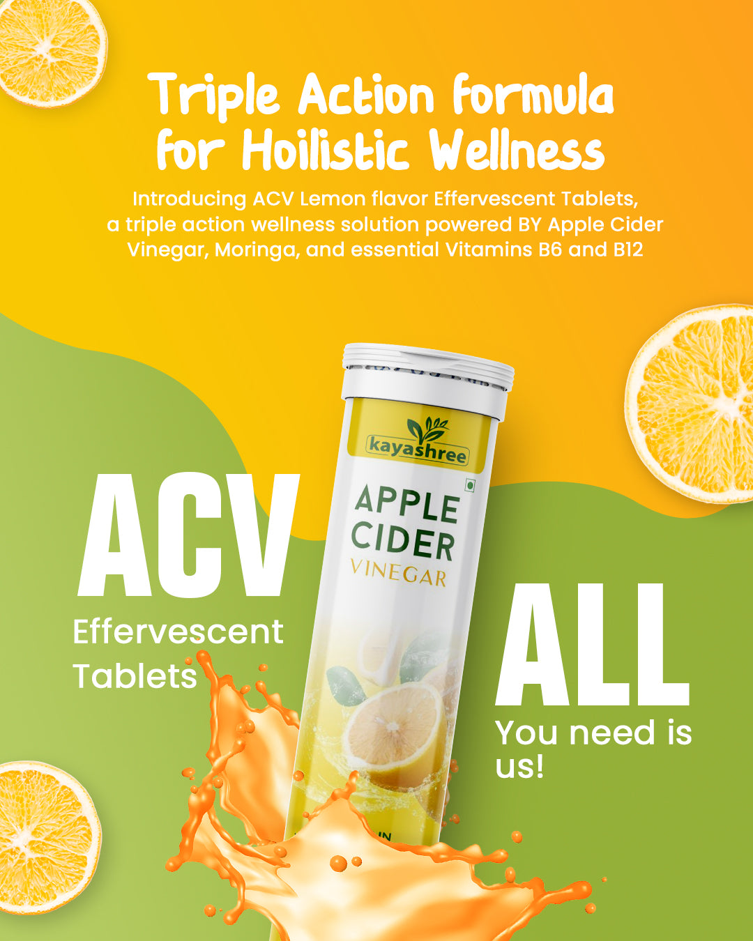 Kayashree ACV Lemon Effervescent Tablets are a convenient and refreshing way to include Apple Cider Vinegar in your daily routine. Made with a tangy lemon flavor, these tablets help support weight management, improve digestion, and promote natural detoxification without the strong taste of liquid ACV. The effervescent formula dissolves quickly in water, making it easy to consume while helping the body absorb nutrients effectively. Trusted by millions, it is an ideal choice for those looking for a simple, tasty, and effective wellness solution.