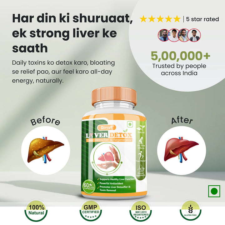 Divyashree Liver Detox is the best natural supplement to support your liver health and clear liver. It contains powerful ayurvedic ingredients that help in reversing fatty liver , clear out toxins and improve metabolism . This formula strengthens your liver function, boosts immunity and aids in maintaining a healthy weight. It is made with natural ayurvedic herbs and liver detox is safe and effective and the bonus points is that it does not have any side effects making it the Best Ayurvedic Medicine For Fatty Liver and a trusted Fatty Liver Ayurvedic Medicine for overall liver care.
